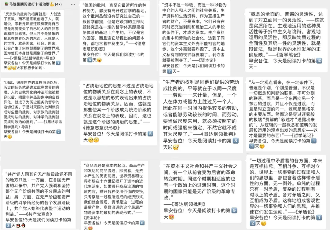 借此阅读打卡平台,同学们坚持深耕经典沃土,不断学习马克思主义立场、观点和方法,练就用马克思主义指导工作和生活的本领。下面,就让我们共同回顾本次暑期阅读打卡活动的精彩瞬间!