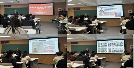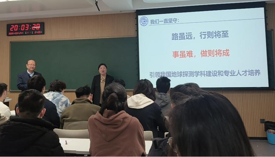课堂上,刘财教授以社会上对于“地质工作=野外吃苦”的认知偏差为切人点,强调了地质工作在国家发展、解决能源问题和安全挑战中的关键作用,鼓励同学们坚定专业信念,正确面对地学学科“艰苦 光荣”的专业特色。刘财教授带领大家回顾了吉林大学地学部七十余年来的发展历程,追溯了李四光、黄大年等前辈先贤的奋斗历程,提出要从“研、严、妍”三个维度培养高质量人才。他提出同学们要以黄大年同志为榜样,时刻铭记“这里是黄大年精神的发源地,黄大年曾经战斗过的地方”,学习他“心有大我、至诚报国”的爱国情怀,鼓励学生在学习中要勇于探索、敢于创新,不断提升自己的专业素养和综合能力,为国家的地质事业做出自己的贡献。